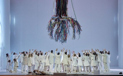 Светодиоды, неоновые тона, водопад из пластиковых труб, символизирующих виртуальную матрицу взаимозависимости всех ото всего (от свежей смелости этой мысли трудно не всплеснуть руками), светоотражающие краски, чернозём на белом и красное на чёрном, иллюзии аллюзий, семантика диффузий и так далее… Местами наивная примитивность, претендующая на смысловую глубину, вызывает снисходительное умиление: постановщик старается, это хорошо; но зрителю сложно оценивать прилежание авторов, — зритель справедливо ждёт по-малеровски ясного и цельного высказывания и смыслового посыла. И если с внятностью и цельностью в спектакле Биейто сложновато, то вот с посылом проблем никаких: посыл вполне себе присутствует.