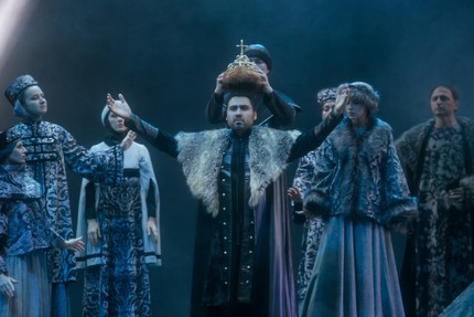 На сей раз постановочная история «Бориса Годунова» в Краснодаре 2022 года явно перекликается с московской «революцией» 1989 года, ведь первая публикация авторских партитур двух добавленных в обсуждаемой постановке сцен, уже прозвучавших в рамках шести премьерных спектаклей, еще лишь предстоит. Но в подходах к двум постановкам есть существенное отличие. В Краснодаре Ольга Иванова обращается к большому стилю оперного плаката в присущей ей манере психолога-исследователя, делая ставку не просто на главном персонаже, а на противостоянии двух центров силы – царя Бориса и Самозванца под именем убиенного царевича Димитрия, в которого воплощается невероятно ушлый и амбициозный послушник Чудского монастыря Московского Кремля Григорий Отрепьев.
