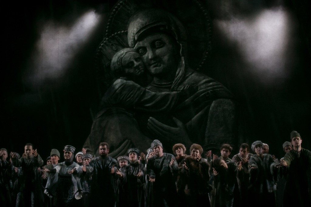 Ничего бытового в сценографии, скроенной по лекалу реалистической абстракции, на этот раз нет, а монументальная символичность «театрального ордера» на уровне яркого гротеска предстает с наложением эффектов видеопроекций на заднике и авансценическом суперзанавесе, так что постановка при ее многоплановости технологически инновационна. Мистика происходящего усилена в ней и мимическим присутствием ряда персонажей в тех сценах, где их де-факто нет и быть не может. В келье Чудова монастыря это «незримое» присутствие Бориса Годунова. В «Сокольниках на Днепре» это уже «реальное» присутствие Юродивого и выступающей единым фронтом с Самозванцем Марины Мнишек.