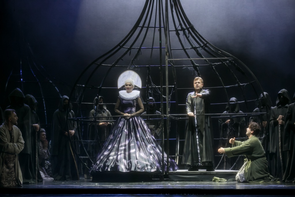 Две вокальные ипостаси – драмсопрановую и меццо-сопрановую – в партии Марины Мнишек соответственно в первый и второй день блестяще представили ведущие солистки театра Гюльнара Низамова и Наталья Бызеева. Партия коварной и расчетливой полячки, решенная и в сценографическом, и в костюмном отношениях в «змеиной» символике, стала одновременно и контрастом, и «родственной параллелью» к образу Самозванца, а именно в этой постановке, в которой сцена у фонтана впервые прозвучала в авторской оркестровке Мусоргского, стала одной из его музыкальных фишек, стала символом возвращения к его наследию, порядок в котором наводится лишь сейчас… Так что если вы потерялись в море редакций «Бориса Годунова», встречаемся в центре краснодарской постановки у фонтана!