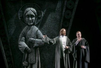 Однако неоднозначность – лучшее, что можно придумать в ситуации с шитой белыми нитками историей Смутного времени, и после подобной впечатляюще мудрой хитрости режиссера-постановщика снова укрепляешься в мысли, что Борис Годунов невиновен. Как раз для того и надо было его «убрать», чтобы выгодную Романовым «тайну» оклеветанный царь навеки унес бы с собой в могилу! С блеска упомянутого выше кинжала собственно и начинается предсмертный монолог Бориса, истинного царя-праведника, а убранство сцены, ненадолго возвращавшее до этого к официозу гигантскими скипетром и державой из сцены венчания Бориса на царство, ожидаемо и закономерно сменяется барельефом Богородицы с Младенцем, что был символом первой картины – призвания Бориса Годунова на царство.