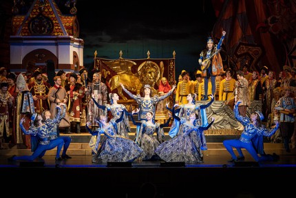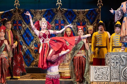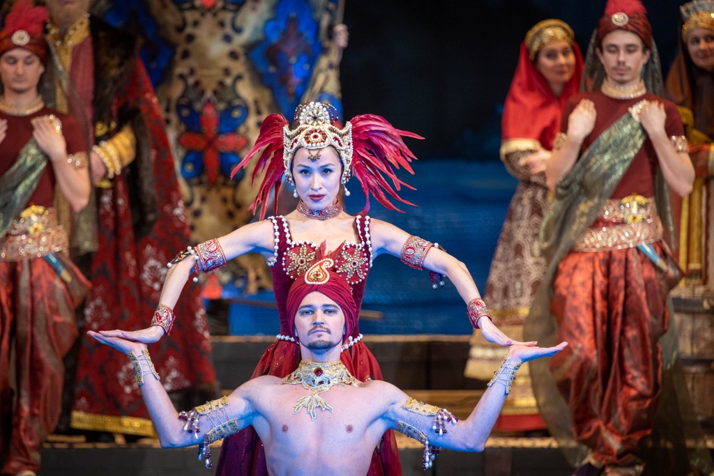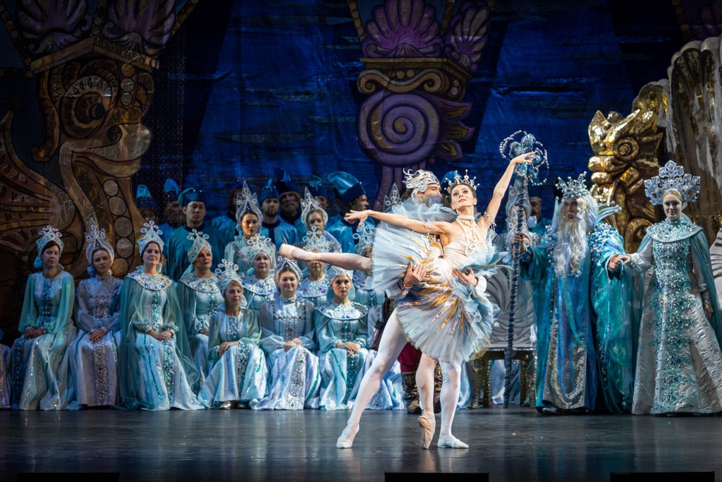 Особое включение, словно спектакль в спектакле, – фантастическая картина подводного царства с диковинными обитателями морского дна и большой балетной сюитой природных стихий (в основном, рек), костюмированная идея которой поразительно удачно навеяна подобной классической сюитой из балета Цезаря Пуни «Дочь Фараона».