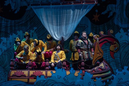 На финал этих заметок мы приберегли не менее яркие впечатления от трех заморских гостей – Варяжского (Геннадий Родионов, Аскар Абдразаков), Индийского (Ильгам Валиев, Алим Каюмов) и Веденецкого (Айтуган Вальмухаметов, Ян Лейше), партии которых – де-факто их известнейшие хрестоматийные арии. По окончании второго спектакля, в котором Аскар Абдразаков, помимо амплуа режиссера, выступил и как певец-артист, воплотив образ Варяжского гостя, подумалось, что вот теперь премьера в Уфе состоялась уж точно! И по партиям трех гостей, в частности, видно, что в спектакле сошлись исполнительские силы разных вокальных поколений. Молодые певцы, выходя на сцену с маститыми мастерами, несомненно, приобретают опыт, а мастера, в свою очередь, этот опыт им передают. Так было всегда, так будет и впредь до тех пор, пока мы будем возвращаться к своим истокам…