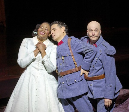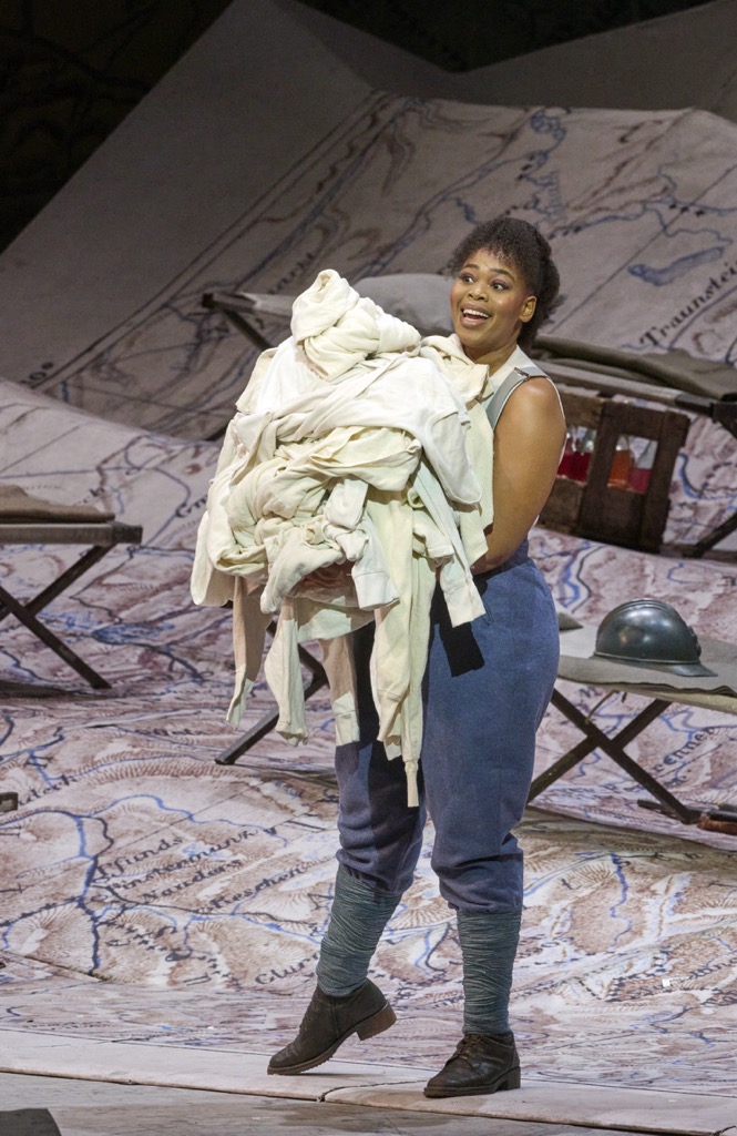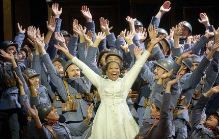 Южноафриканская сопрано Претти Йенде, выступившая в партии Мари, — певица, без сомнений, умеющая петь, и, конечно же, нужно бережно относиться к особенностям школы и индивидуальности каждого исполнителя. Но то, что я услышал в этот вечер, к бельканто как к красивому пению относилось весьма условно. Местами это было громко (не сомневаюсь, что верхние ноты, которыми певица щедро отоваривала зал, вылетали за пределы театра и заглушали звон трамваев на Ринге [3], местами это было звонко, местами обаятельно, местами зажигательно.