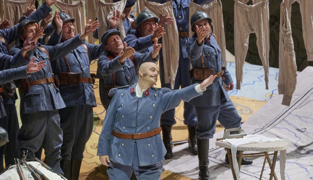 1) сценография, пародирующая как милитаристский угар неотёсанных французских солдафонов, так и дряхлое благополучие рафинированной тирольской знати;