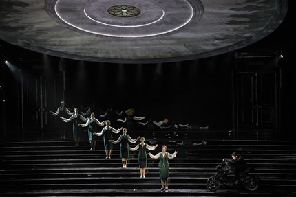 «Свадебно-похоронную» процессию, хотя вынос тела Синодала лишь подразумевается, но в реальности не происходит, берут на себя статисты с огромными букетами, суетящиеся практически в каждое мгновенье, но особенно усердствующие под музыку отсутствующих на сей раз праздничных – предполагавшихся по случаю свадьбы – танцев. Эту наивную «игру в бирюльки» режиссер явно подглядел в «фирменной» метóде Дмитрия Чернякова, когда музыка танцев сохраняется, но, как в его «Руслане» или «Садко», используется по назначению, решительно несовместному с элементарной логикой и здравым человеческим смыслом: разверзающаяся пропасть по-дилетантски огромна и непреодолима…