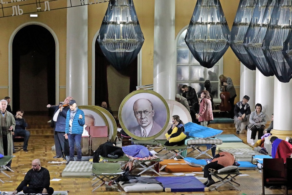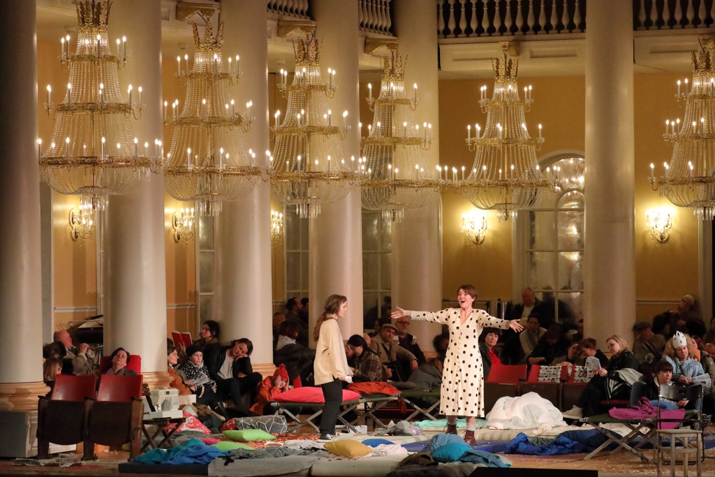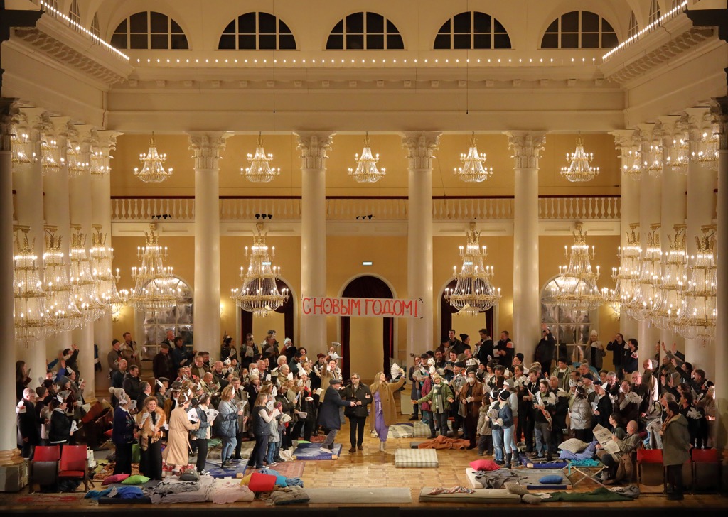 Мы видим зеркальное отражение войны, пришедшей в узнаваемый московский интерьер. Разумеется, речь не о войне 1812 года, а о войне будущей, войне, которой ещё нет. Этот эсхатологически-пророческий ракурс изображения прошлого в будущем был использован Черняковым в берлинской постановке «Бориса Годунова» (2007). Идеально сияющие всеми лампочками гигантские люстры прямо указывают на энергетическую мощь России несмотря на то, что люди, спрятавшиеся от громыхающих взрывов под словно заговорёнными сводами Колонного зала Матвея Казакова, лишились всего, включая нормальную одежду (художник по костюмам Елена Зайцева). Следы энтропии видны и в покосившемся лозунге над президиумом Первого съезда Союза советских композиторов СССР (апрель 1948), превратившемся в ребус из-за отсутствия ключевых букв [7]. Черняков создаёт зловещую антиутопию, в которой хоть и нет прямых аллюзий на текущий момент, но которая не перестаёт поражать многогранностью и глубиной пульсирующего трагизма.