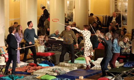 2) К таким перпендикулярным решениям я бы отнёс попытку неудачного самоубийства Андрея Болконского, с которой начинается спектакль, неправдоподобный «визит» Наташи Ростовой с отцом к старому князю Болконскому и, конечно, медитативно-мрачный открытый финал, в котором персонаж, озвучивающий партию Кутузова (Дм. Ульянов), укладывается на погребальное ложе со словами «Теперь Россия спасена».
