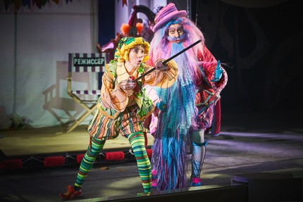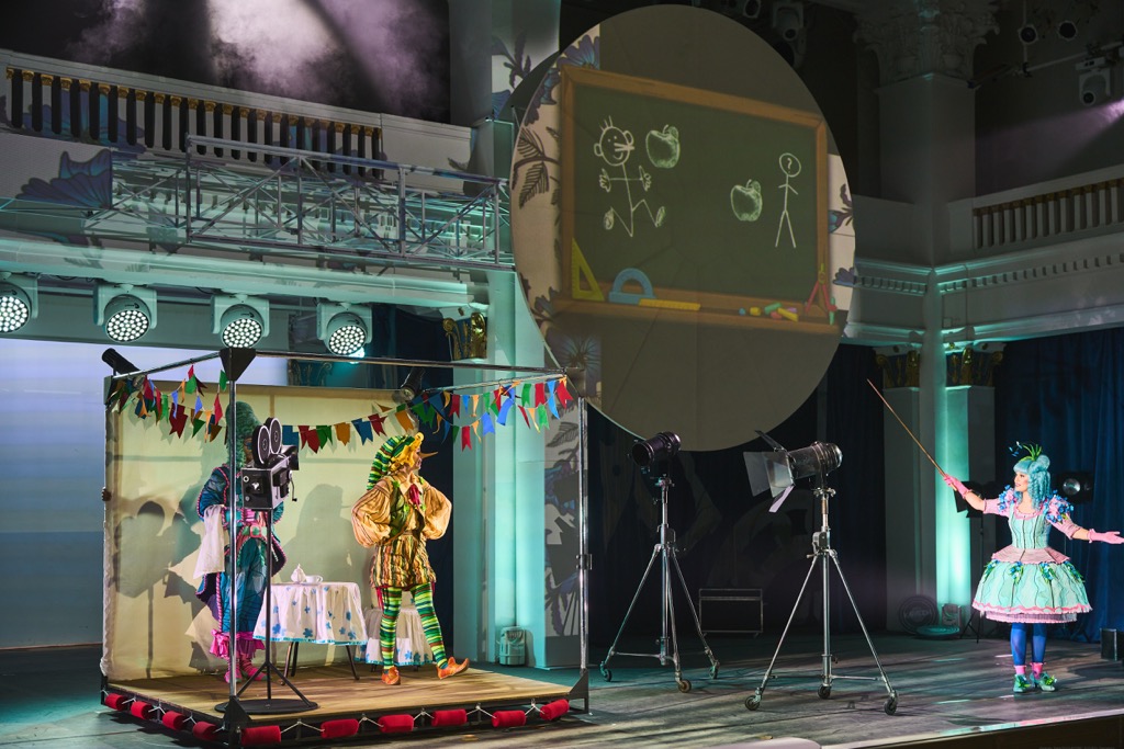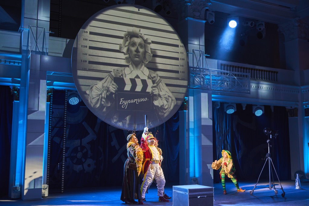 После капитальной реконструкции 2017 года Малый зал НОВАТа, служивший когда-то концертной площадкой, стал активно использоваться и для театральных проектов. И за это время «колонно-балконное» – в соответствии с архитектурным ордером оформления зала – пространство Малой сцены в отсутствие классических кулис, колосников и занавеса обживалось постановщиками с не повторявшейся каждый раз выдумкой! И поэтому стало совершенно ясно, что пределам освоения этой сцены поистине нет совершенства! Так, на сей раз в спектакле была реализована атмосфера призрачной киностудии, павильона для съемок, где приключениям Буратино, его друзей и врагов был дан зеленый свет театра.