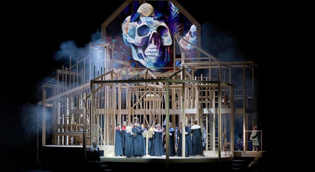 Единственная героиня, не выдерживающая испытания страхом перед смертью, — это Мать Мария, наставница молодых послушниц. В металлическом сиянии и драматической силе вокала французской меццо Евы-Мо Юбо этот образ становится настоящим полем битвы между долгом и страхом, между декларациями и реальностью, а сцена мучительного выбора между мужественной кончиной и позорным бегством от мученической смерти, разворачивающаяся перед бордово-кровавым, как лезвие гильотины, занавесом, превращается в психиатрическую кульминацию представления.