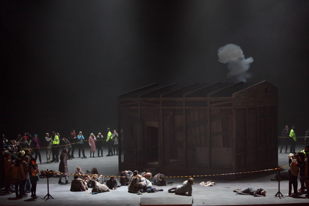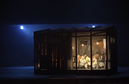Когда в послекризисном 2009 году готовился этот спектакль, Дм. Черняков предложил Баварской опере настолько экономичное оформление сцены, что в режиссёра тут влюбились сразу все: от артистов до финансистов. Ну, может быть, кроме осветителей. Дело в том, что плавающая по пустой сцене избушка-путешественница в виде реечного сарайчика [1] должна была стать главным местом почти трёхчасового действия, а подсветка персонажей, находящихся внутри неё, должна была переключаться в соответствии с движениями этой гиперактивной конструкции так, чтобы и артистов было видно, и чтобы свет зрителям в глаза не лупил.