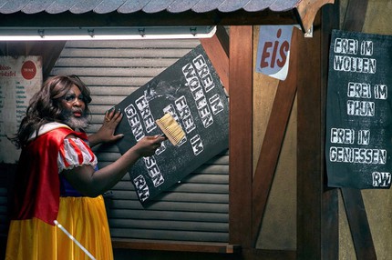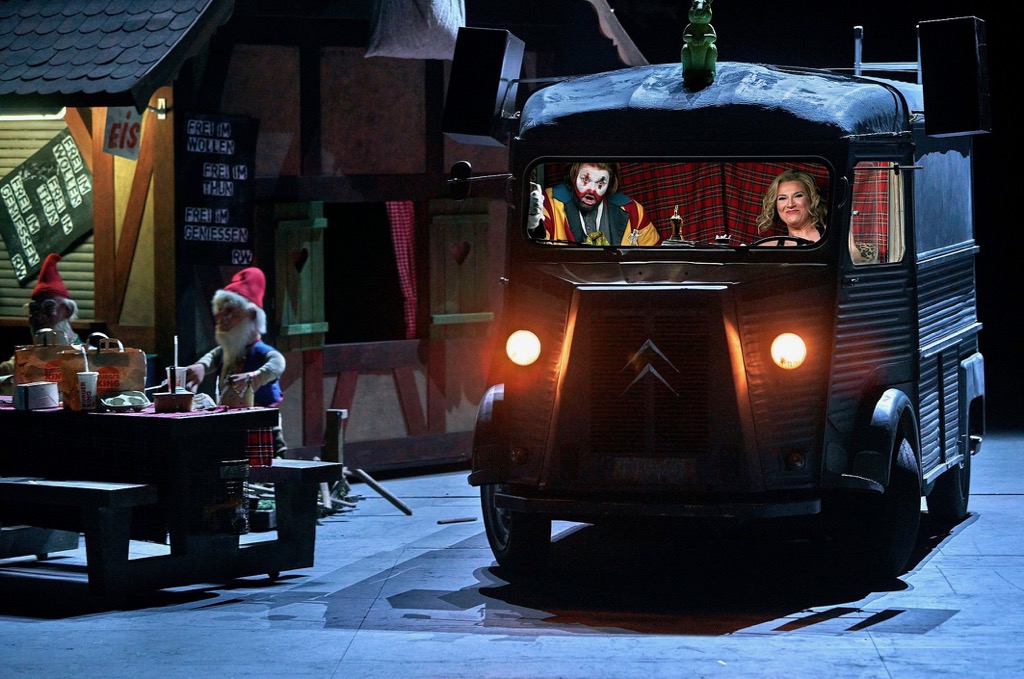 Напомню, что в интерпретации режиссёра Тобиаса Кратцера главный герой оперы «Тангейзер» — свободный художник [1], музыкант, певец, который уходит из академического искусства в неакадемический отпуск, намереваясь освежиться, испытать взрыв эмоций [2] и разнообразить репертуар. В этом ему помогают уличные артисты-отщепенцы, не принятые и не понятые консервативным художественным сообществом. Распущенная Венера, которая в спектакле Т. Кратцера предстаёт персонализацией Марины Абрамович [3], карлик Оскар (вымышленный персонаж, символизирует антропологическую неполноценность, отвергаемую традиционным социумом), темнокожий трансвестит Ле Гато Шоколад (по-видимому, чудо-чудное и диво-дивное для тех, кто впервые выехал из тундры и ещё не успел оскоромиться встречей с эскалатором и стиральной машиной).