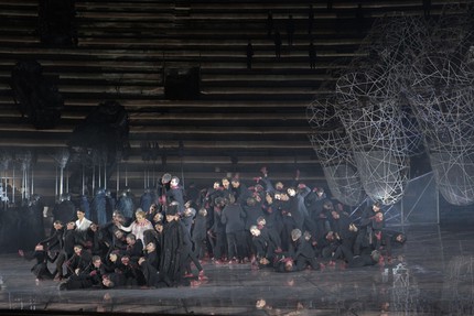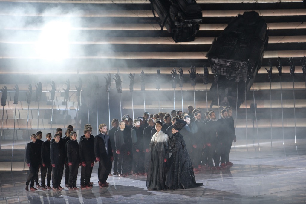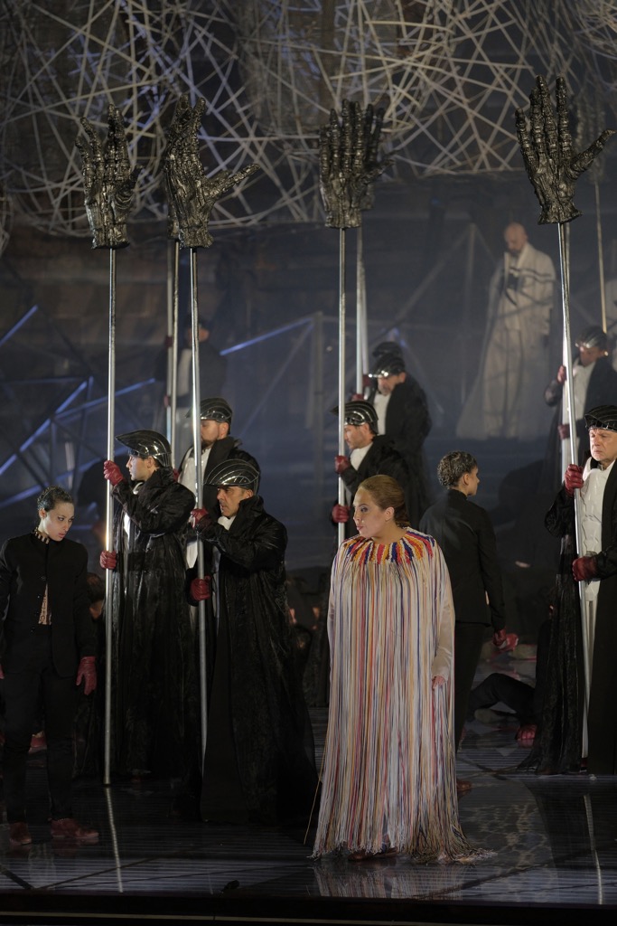 Режиссер представил грандиозное шоу, поместив в центре сцены гигантскую подвижную длань, которая сжимается в кулак, распрямляется и может приласкать, и пригрозить, и прибить. Этот универсальный символ власти находит отражение в стягах и штандартах в форме разноцветных ладоней, помещённых на флагштоки хора и миманса. Статистов, артистов хора и балета на сцене более 400 человек, и это буйство сверкающих золотом и стразами костюмов гипнотизирует.