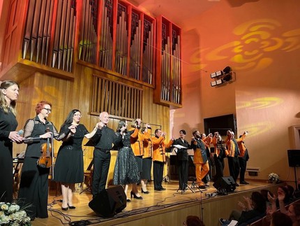 Одним словом, друзья, чудесная получилась опера! Я от души наслаждалась происходящим и звучащим на сцене, при этом чувствуя, что и сами артисты в апельсиновых куртках (любимый цвет Каменского) разделяют мои восторги. Эффектная, игривая, яркая музыка Игоря Машукова, предлагающая музыкантам проявить весь свой арсенал изобразительных средств, интересна для исполнения. А это так важно! Когда есть интерес, то загораются глаза, и процесс подготовки и выступления превращается в настоящий драйв. Так, подарившие нам коровий бал исполнители — ансамбль современной музыки «Red sound» в составе: Наталья Кокорина, Александра Александрова, Андрей Чернопазов, Кирилл Троицкий, Олег Бударацкий, превосходные и артистичные приглашенные солисты Миша Нор, Ольга Попова, Дарья Терещенко, замечательные пермские музыканты Марина Окуневич, Анна Кохан и Сергей Крылов, отвечающая за электронику Анастасия Выймова и управляющая всем этим красочным действом дирижер Татьяна Иванова — были на высоте сродни авиатору и поэту Василию Каменскому. Слушатели приняли оперу на «ура», и я вместе с ними.