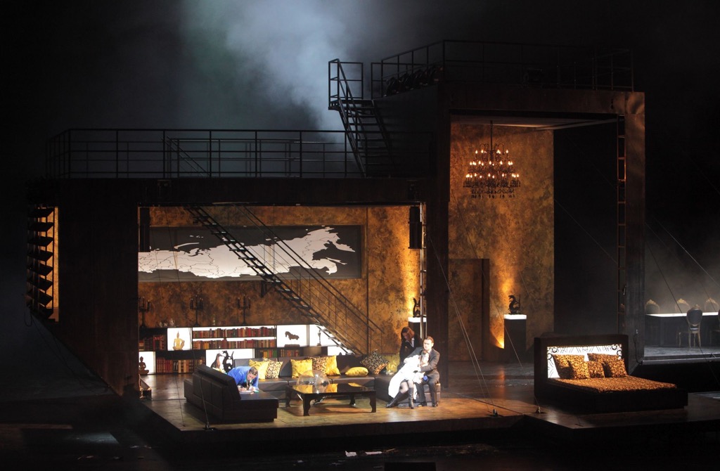 На сцене (сценограф Ребекка Рингст) мы видим циклопических размеров бронепоезд-трансформер, символизирующий крепость-бункер, в котором вершатся судьбы страны, совершаются перевороты, личное переплетается с публичным, плетутся интриги, зреют заговоры, устраняются политические противники. Убрав из своего спектакля национальную приуроченность действия к России и размыв хронотоп повествования [4], К. Биейто выходит на уровень интеллектуально ёмкого нарратива, вскрывающего глубинные пласты как пушкинской мистификации, так и грандиозной звуковой фрески Мусоргского.