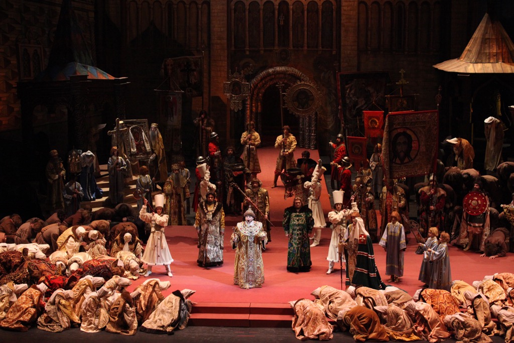 Итак, несмотря на современное прочтение и большое количество иностранных исполнителей, спектакль Баварской оперы выглядит и звучит ярко и гармонично. Теперь посмотрим, что происходит с партитурой Мусоргского в традиционно красочном монументальном спектакле Большого театра России, где редакция Н. А. Римского-Корсакова с добавлением перед сценой под Кромами сцены у Собора Василия Блаженного в оркестровке М. М. Ипполитова-Иванова, но без сцены у Марины Мнишек в постановке Леонида Баратова 1948 года.