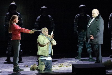 Баварский «Борис Годунов», пожалуй, единственный спектакль режиссёра Каликсто Биейто, не вызывающий ни одного вопроса к этому скандальному постановщику. Особенно после того, как в возобновлении 2023 года со сцены убрали портреты современных мировых лидеров: белые пустые прямоугольные плакаты наполнили массовые сцены вневременным философским содержанием, очистив сценографию от сиюминутной политической конъюнктуры. Единственным спорным моментом постановки я бы назвал образ Юродивого, представленного хиппи-звездой в окружении поклонниц и детей, перед которыми этот странный суперстар хвастает копеечкой. Остальные все мизансцены на удивление безупречны.