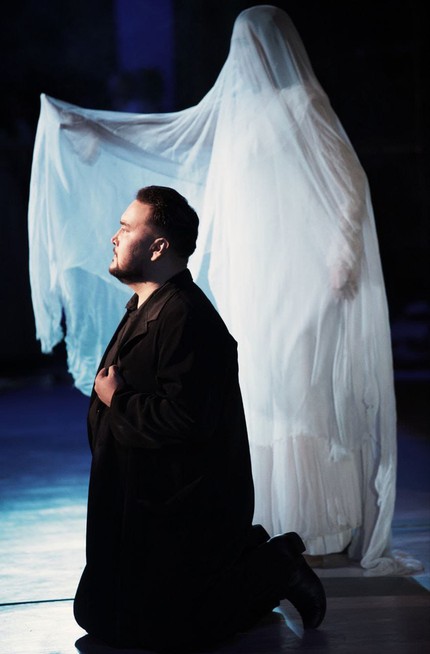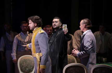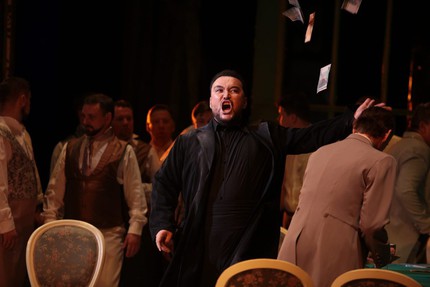 Но прежде чем говорить об этой работе певца, о работах выступивших вместе с ним в этот вечер коллег по сцене и работе дирижера, несколько слов скажем о самóй постановке. Команде во главе с Пламеном Карталовым в составе сценографа Александра Костюченко, художника костюмам Нины Гурло и художника по свету Ирины Вторниковой довольно скромными, мобильными, но действенными средствами удалось создать завораживающую иллюзию мистического пространства зеркал, теней и отражений. В этом иррациональном пространстве, подчиненном воплощению навязчивого наваждения Германа, всё движется сверхидеей карточной игры. Ставкой в ней де-факто становятся жизни трех персонажей – Лизы, Германа и Графини, фигура которой как раз и рождает всю карточную мистику.