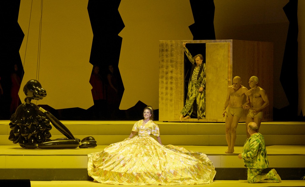 Изобилующую ультразвуковыми верхними нотами партию Венеры, превращающейся в Шефиню комитета госбезопасности Гопопо, с блеском исполнила французско-кипрская сопрано Сара Аристиду. В спектакле Я. Лауэрса у Венеры-гэбэшницы огромный ярко-жёлтый кринолин (автор костюмов — Лот Лемм), под которым легко помещаются пять-шесть человек, но певица и в таком тяжёлом одеянии легко справляется с надрывными пассажами.