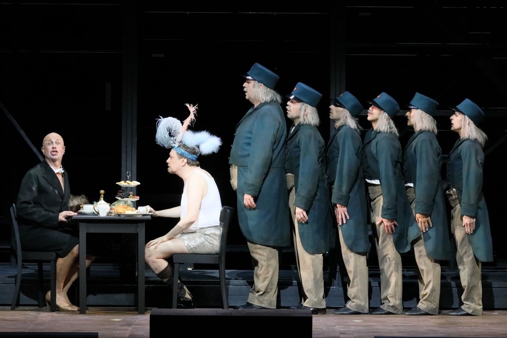 Конечно, весело наблюдать за тем, как почти голый начальник тюрьмы Франк в искромётном исполнении Маркуса Брюка достаёт из своих усыпанных блёстками женских микротрусиков разные предметы, включая огромный полуметровый тюремный ключ (хорошо ещё, не гаечный и не разводной!), но трёхактный массив штраусовской партитуры великоват для таких откровений и испытания безразмерной пошлостью не выдерживает. Действие III акта скатывается в тоскливую эстрадность, когда даже 5-минутный виртуозный степ (филигранная работа Макса Поллака) не может компенсировать отсутствия внятной драматургии.