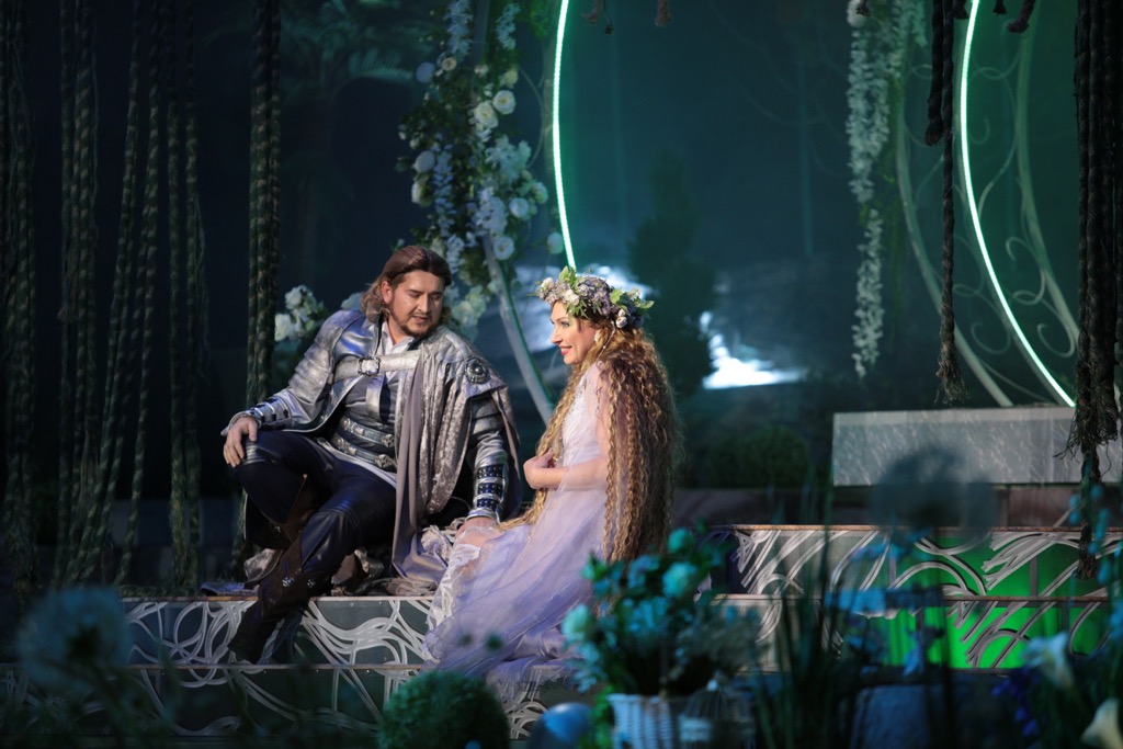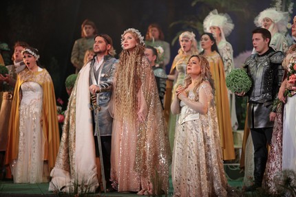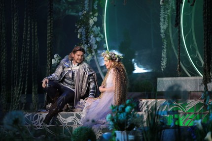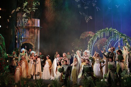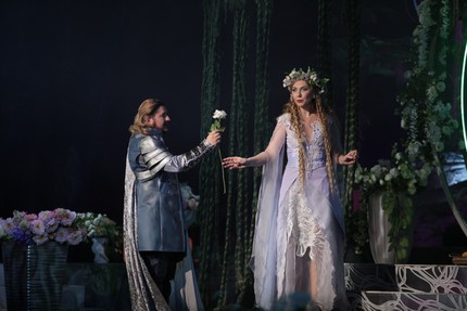 Следуя духу и букве романтической партитуры Чайковского, постановщики пошли по пути классической традиции, создав невероятно зрелищное пространство спектакля. Его живописность на этот раз достигается поразительно масштабным искусством театральной флористики. Пусть она и не живая, хотя впечатление живого есть, цветочное убранство просто благоухает в музыке, которая вместе со сценической дымкой на фоне цветочного (лучше даже сказать цветущего) антуража с открытием занавеса сразу начинает волшебно обволакивать слух, властно увлекать в чувственные лирические эмпиреи партитуры.