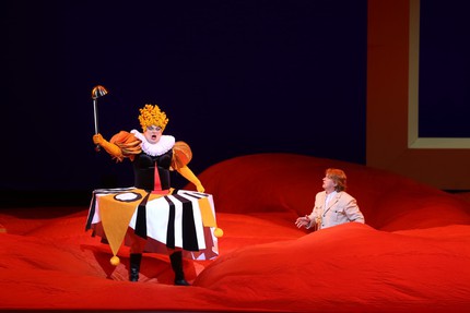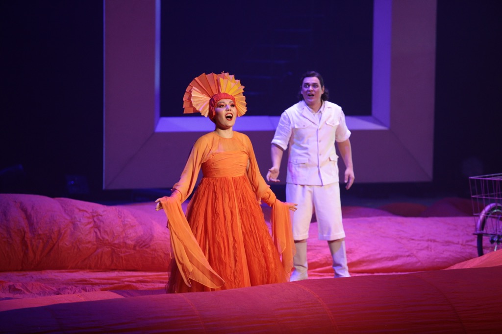 Все эти аллюзии рельефно ярко читаются в многоплановости мизансцен и символике спектакля, но данный аспект на жизнерадостность восприятия сюжета о государственном заговоре против Принца, заколдованного на любовь к трем апельсинам, не давит. Борьба сил добра и зла за хеппи-энд со свадьбой Принца и Принцессы Нинетты, «жительницы» одного из трех похищенных у Кухарки апельсинов, весьма остроумно и эффектно вписана в пространство сказки. И в ней лицедейство главных персонажей, «декламирующих свои эмоции» – в отсутствие прописанных арий – исключительно в речитативных монологах и диалогах, становится главным, определяющим градус доверия к происходящему на сцене.