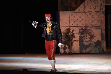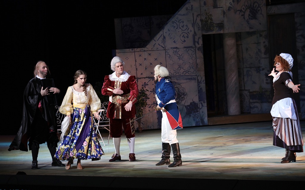 До ансамблей ли, когда в сольных эпизодах легкая колоратура Анастасия Михновец (Розина) и лирический тенор Валерий Макаров (Альмавива) лишь только балансировали вокруг да около стиля Россини… Несколько «интереснее» показали себя басы Дмитрий Капилов (Бартоло) и Андрей Селютин (Базилио), а единственным, кто, вписавшись в свой образ и с азартом отдаваясь актерской игре, не забывал петь именно Россини, а не какого-то «на ходу придуманного» композитора, оказался баритон Алексей Макшанцев в партии Фигаро. В вокале далеко не всё идеально было и у него, но спектакль, который дирижер методично старался наполнять дыханием Россини, среди певцов держался лишь на обаянии молодости и оптимистически подкупающей вокальной адекватности титульного героя.