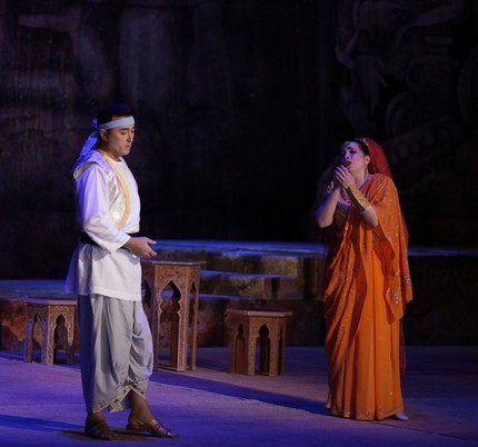 Из «квартета» главных персонажей с точки зрения соответствия стилистике музыки на высоте оказалась лишь тройка мужских голосов – тенор Рамиз Усманов (Надир), баритон Рахим Мирзакамалов (Зурга) и бас Джабраил Идрисов (Нурабад). Сопрано Лятифе Абиева в партии Лейлы продемонстрировала неплохие вокальные данные, что называется, вполне зачетно показав и вокальную в известной мере сноровку, и актерскую темпераментность. Однако проблема певицы была заключена в том, что рафинированно тонкая, хрустально вышколенная элегантность французского лирического стиля – то, что в итальянской опере мы назвали бы искусством бельканто – именно в этой партии, увы, не восторжествовала.