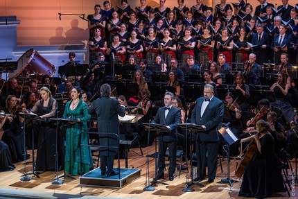 Это была типично итальянская музыка с латинскими истоками, но для русскоязычной аудитории ее наполненность мощным духовным пафосом на волне звучащего русского слова, несомненно, возросла. При этом для широкой публики с интернационального языка музыки русскоязычие сняло, кажется, последнюю тайную печать, а на волне высочайшего музыкантского профессионализма в этом проекте соединились Российский национальный молодежный симфонический оркестр, Государственная академическая хоровая капелла России имени А.А. Юрлова (художественный руководитель и главный дирижер – Геннадий Дмитряк), солисты Валентина Феденёва (сопрано), Агунда Кулаева (меццо-сопрано), Алексей Татаринцев (тенор), Алексей Тихомиров (бас) и дирижер Дмитрий Юровский.