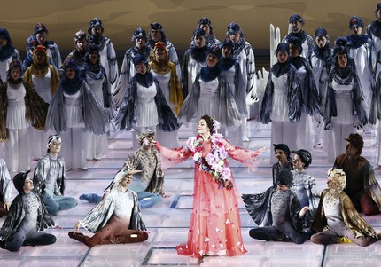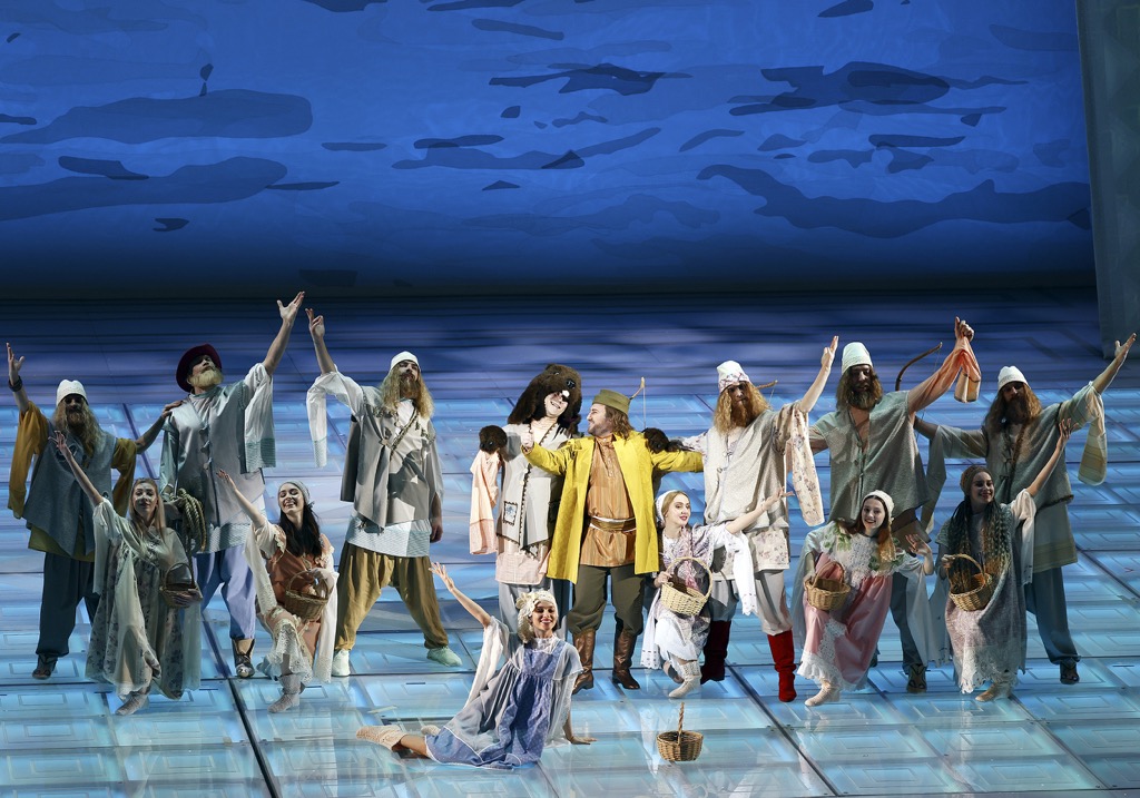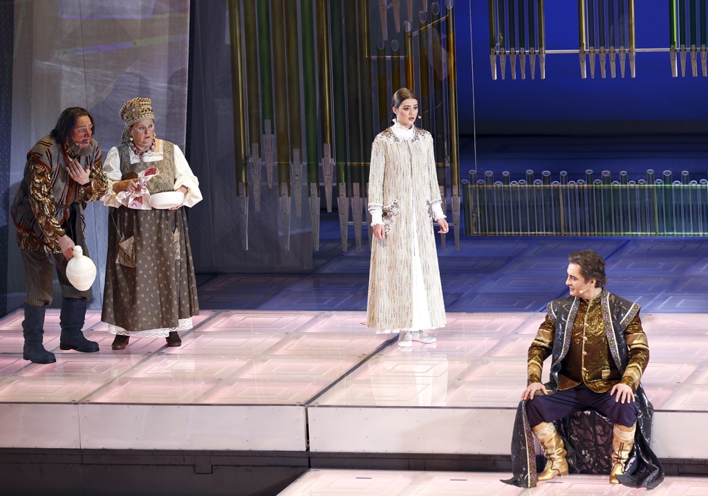 И костюмное, и хореографическое – с участием миманса – решение этой большой вокально-хоровой сцены (хореограф и режиссер по пластике – Виктория Арчая) настолько примитивно, что перенесение с Новой сцены Большого на детский утренник в районном Доме культуры зрителю, увы, обеспечено… При этом тот же самый художник-постановщик создает настолько примитивную абстрактную сценографию (говоря выше о студийности, именно это мы имели в виду), что вся постановка начинает ассоциироваться с откровенно бюджетным semi-stage проектом. С первого открытия занавеса мы попадаем в царство свисающих гирлянд из решеток, подозрительно смахивающих на систему органных труб со сплющенными соплами. Что тебе царство лесных обитателей, что тебе Берендеевка, что тебе царские покои, что заповедный лес, что, наконец, Ярилина долина – разницы никакой!