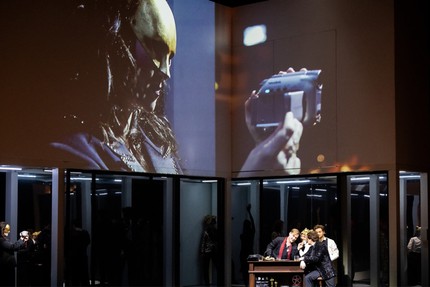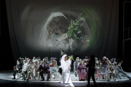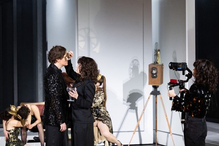 Вообще в спектакле много живых видеопроекций происходящего на сцене на большие экраны, составляющие основу совершенно пустой сценографии (сценограф Фабьен Тэйнь, костюмы Yashi, операторы Селина Барил или Мариано Маргарит). Но испытания крупными планами с блеском выдерживает исполнительница партии Джульетты французская сопрано Мелисса Пети: актёрское мастерство певицы выше всяких похвал. Но когда в первую и последнюю брачную ночь Джульетта лежит в кровати с видеокамерой и снимает свой диалог и расставание с Ромео, становится понятно, что режиссёр, придумавший такую мизансцену, не только не чувствует материал, с которым работает, но и базового чутья к эмоциональному наполнению инсценируемой им музыки не имеет. Дело в том, что в опере Ш. Гуно музыкальные темы, связанные с Джульеттой и Ромео, наполнены такой возвышенной нежностью, что появление во время их исполнения суетливых видеокамер или клубных эротических танцев неизбежно разрушает магию этой музыки.