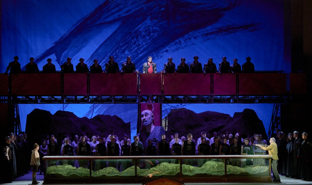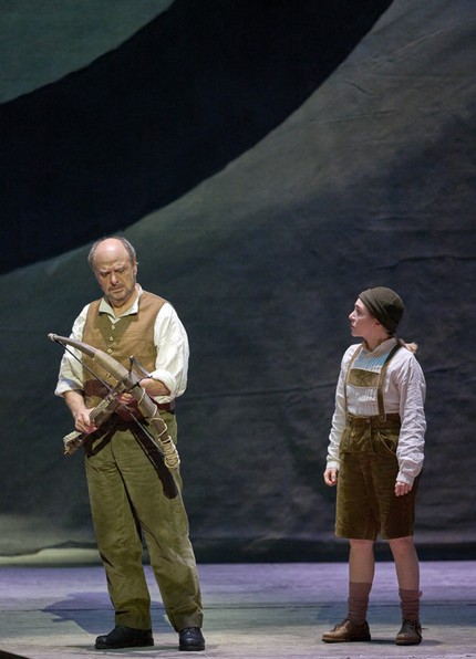 Издевательский спектакль Дэвида Паунтни, заметим, идеально согласуется с нудной беспросветностью партитуры. Посредством вялой пластики, посконных мизансценных решений, блёклых цветовых реплик сельских костюмов, наятнутой сетки-занавеса с изображением прострелянной мишени, сермяжной кукольной хореографии и марионеточной же сценографии (оформитель Ричард Хадсон) режиссёр безжалостно показывает непреодолимую провинциальность альпийско-крестьянского менталитета.