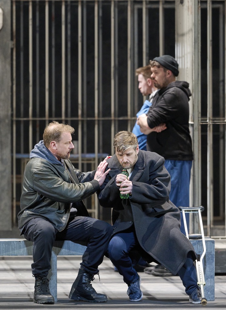 Но главным же испытанием должен стать поцелуй Кундри, который играет в этом прочтении совершенно удивительную роль: поцелуй настоящей страстной женщины возвращает уже почти бесполого гламурированного юнца к воспоминаниям о своей пацанской сущности, о своём тюремном прошлом, об Амфортасе (превосходная вокально-драматическая работа баритона Михаэля Наги), который так же потерял здесь своё мужское достоинство (копьё как фаллический символ).