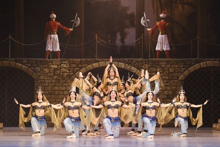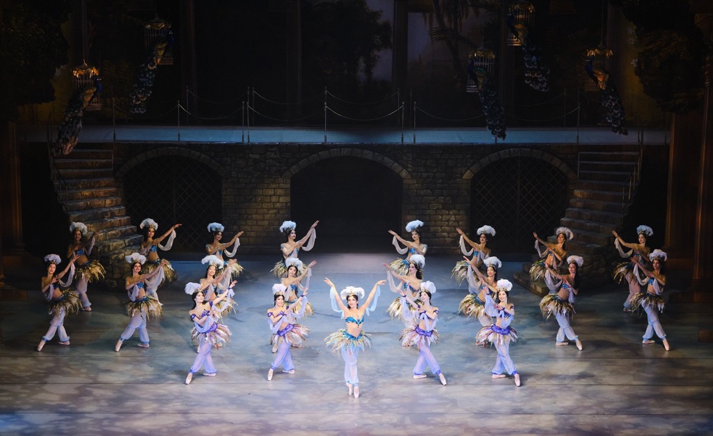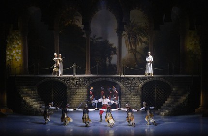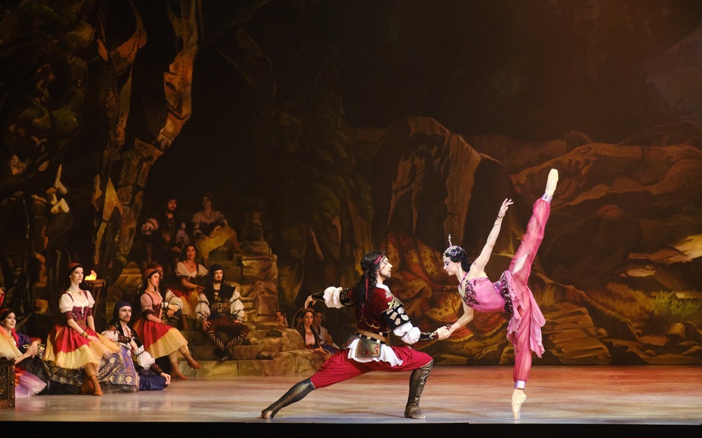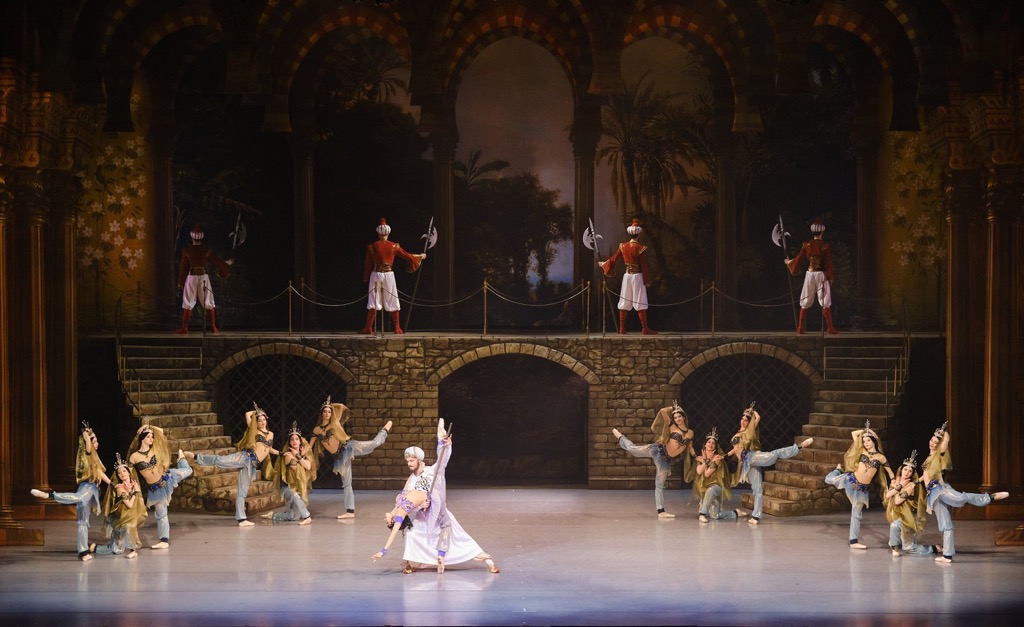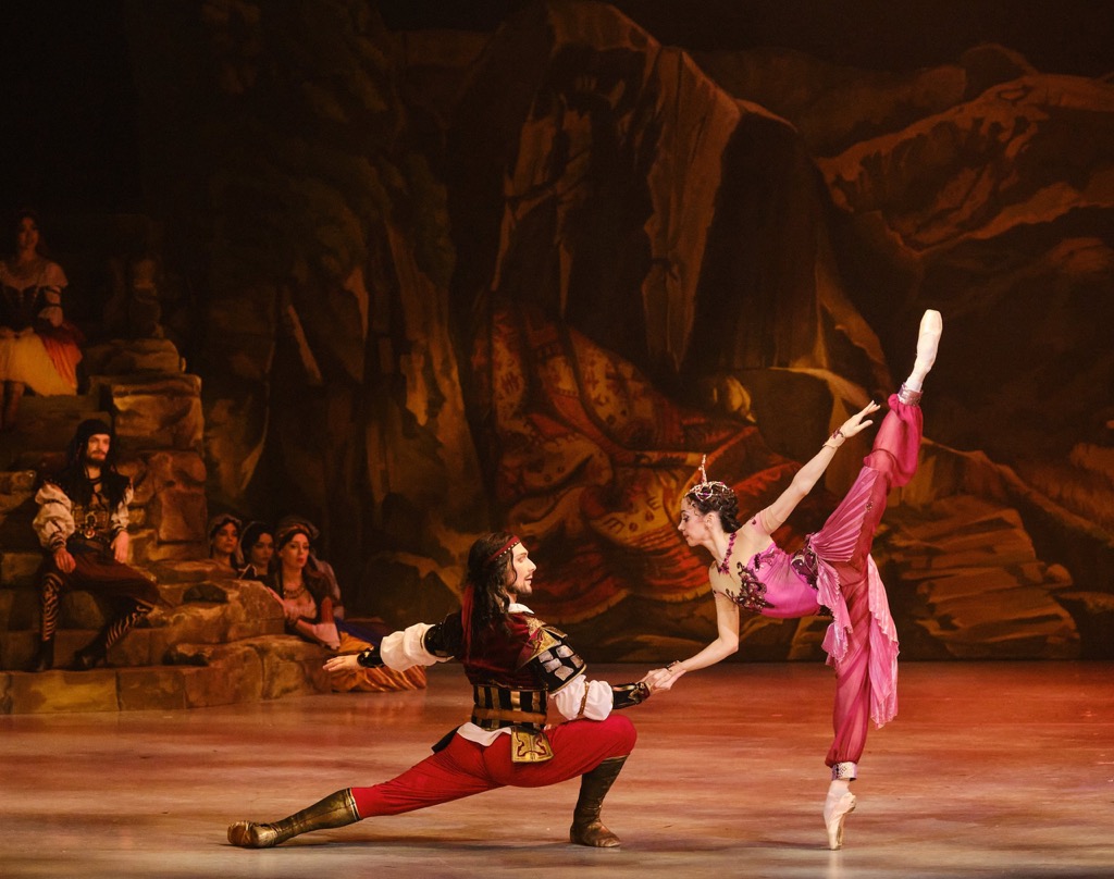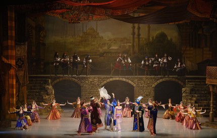 Созерцать пиршество романтического балета-феерии рецензенту посчастливилось все три премьерных дня, и это было настолько сильное и всеобъемлющее погружение в сказку Востока, что время, проведенное в ней, можно уверенно назвать временем театрального счастья – музыкального, хореографического и артистического. Эта постановка предъявила прекрасный классический кордебалет, изумительный ансамбль харáктерных танцовщиков и солистов, потрясающе ярких артистов действенных мизансцен и пантомимы. Комически-пантомимная связка Исаака Ланкедема (торговца невольниками) и Сеида-паши (владельца гарема) обычно несет возрастную окраску. Однако теперь Сеид-паша – красавец хоть куда: он молод и импозантен, он галантно проводит мизансцены и с пленившей его Медорой, и с его невольницей Гюльнарой, претендующей на роль его любимой жены.
