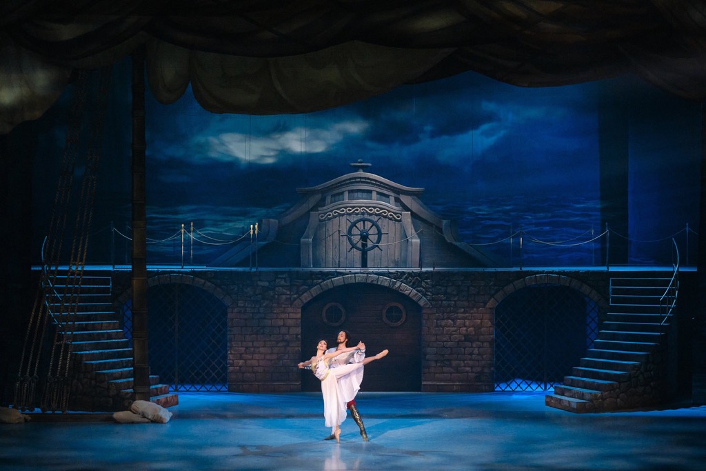 Пролог с попавшим в шторм кораблем корсаров – совместное волшебство машинерии, хореопластики и видеоконтента, а перед эпилогом в финале есть и неистовая сцена погони за главными героями, феноменально решенная исключительно средствами классической хореографии. И в этой концепции «the best of» захватывающая поглощенность сквозным развитием сюжета являет заветную психологическую доминанту необычайно благодатного зрительского восприятия. «Корсар» – балет французский, но благодаря французу Петипа это и балет русский, а для русского балета хореографическое наследие мэтра – наше всё! Творчески развивая наследие Петипа, понимая всю его важность, во втором акте «Дворец Сеида-паши» возвращение Медоры в гарем Юлиана Малхасянц ассоциирует с пойманной птицей, томящейся в золотой клетке, и это весьма сильный, далеко не ординарный ход.