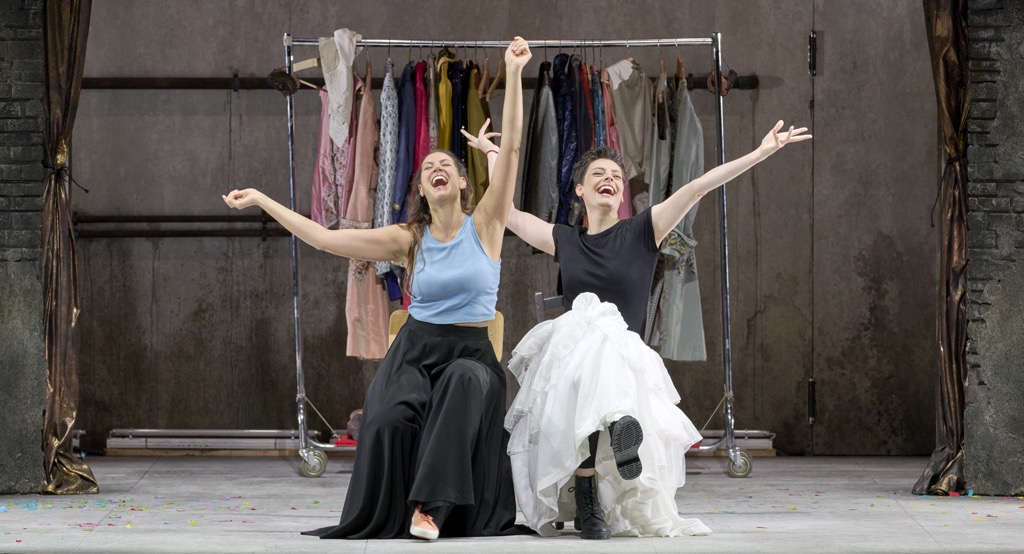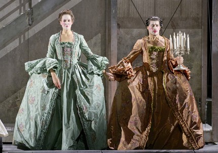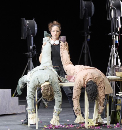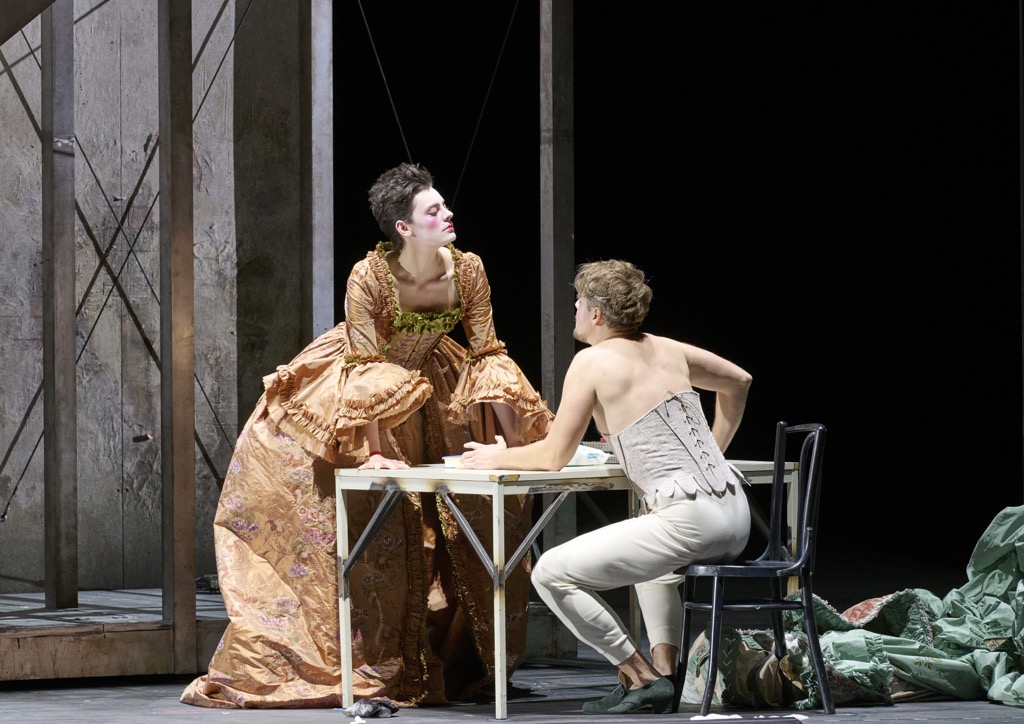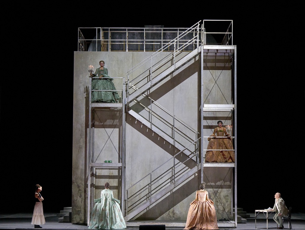 Восьмиметровая вертикальная конструкция, имитирующая позолоченный портал зеркала сцены барочного театра, становится главной визуальной опорой удивительного оформления спектакля, выполненного Джанлукой Фаласки. Режиссёр заставляет артистов подниматься и спускаться по лестницам этой вращающейся конструкции в тяжёлых кринолинах. Причём, в кринолины во втором действии одеты и мужчины, и женщины: ведь сегодня гендерная нейтральность персонажей на театре — необходимая черта. Впрочем, эта режиссёрская глупость гармонично вписалась в магистральную глупость самой оперы.