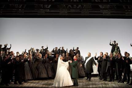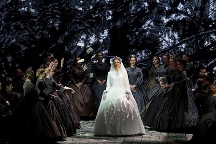 В скупой аскетичности и преимущественно черно-белой – лишь дозировано цветной – графичности спектакля, несмотря на сказочно-фантастическую составляющую его сюжета, всё подчинено главному – достижению музыкально-психологической выразительности и раскрытию широкого спектра человеческой чувственности в свете трагической коллизии. Мизансцены точны и минималистичны, сценография – полнейшая абстракция, а весь мало-мальский реализм сконцентрирован в видеопроекционных задниках и классически строгом гардеробе, созданном по лекалу XIX века. Кроме второго – свадебного – акта и сцены в комнате Княгини все локализации сюжета – пленэрные, однако и то, и другое более чем условно. И всё же сама постановка абсолютно самодостаточна и функциональна: каких-то прорывных находок в ней нет, но ведь нет и никаких несуразностей. С ног на голову в ней ничего не поставлено, и даже отсутсвие собственно сказочного антуража и каких бы то ни было элементов самобытной фольклорности для эстетики драматического бельканто, на этот раз призванного всей постановочной командой, вовсе не принципиально!