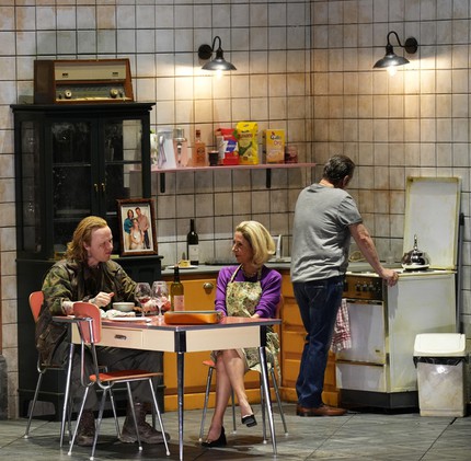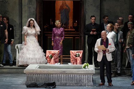 В новом спектакле режиссёра Яна Филиппа Глогера смс-сообщение, то есть письмо главной героини Аменаиды не может быть правильно понято в принципе, потому что в своём письме Аменаида, воспитанная в патриархальной религиозности сицилийской мафиозной семьи, признаётся в любви к… женщине. Обладающий безупречным чутьём к логической убедительности повествования режиссёр Я.-Ф. Глогер всего двумя изменениями либретто превращает изначально нудную и малоинтересную сегодня средневековую санта-барбару [1] в яркий гангстерский боевик в духе Ф. Ф. Копполы.