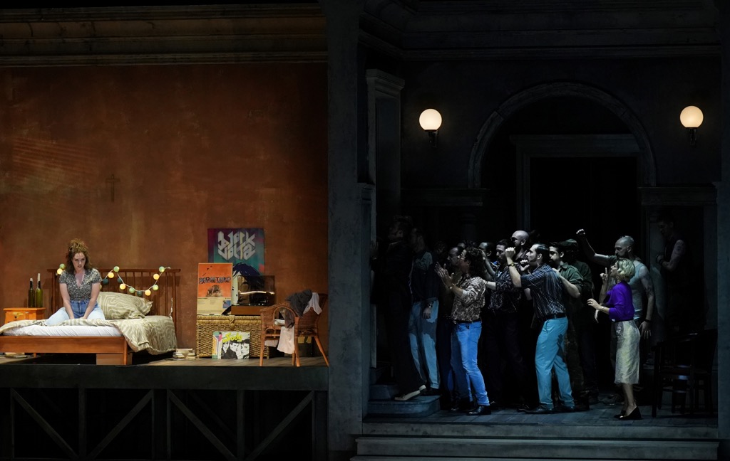 Мы видим, как два враждующих наркокартеля, две мафиозные «семьи» объединяются в противостоянии спецподразделению по борьбе с наркотиками, бойцы которого зрелищно захватывает мафиозное логово в конце третьей картины II акта и потом убивают Танкреда, который в новой версии является не мужчиной, поющим женским голосом [2], а женщиной по имени Танкреди [3].