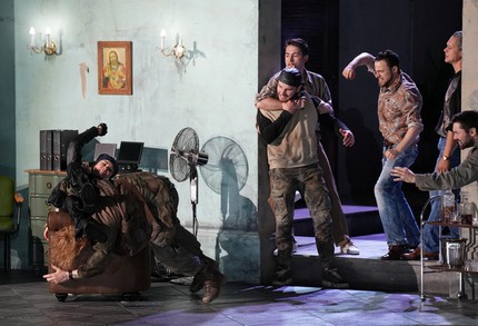 Хор Пражской филармонии (хормейстер Лукаш Василек) создаёт атмосферу настоящего криминального триллера в динамическом обрамлении акробатических боёв, созданных Раном Артуром Брауном, работа которого в мюнхенском спектакле Дм. Чернякова по опере С. С. Прокофьева «Война и мир» стала одной из причин признания этой постановки спектаклем года.