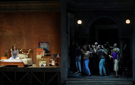 Именно откровением на тему одиночества человека, которого природа создала «белой вороной», и завершает режиссёр душераздирающий финал оперы, которая поставлена в Брегенце в феррарской редакции [4]. Мы видим расстрелянную спецназом истекающую кровью женщину, которая, прощаясь перед смертью со своей подругой и её отцом, не замечает, что в последние минуты её жизни рядом с ней уже давно никого нет…