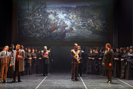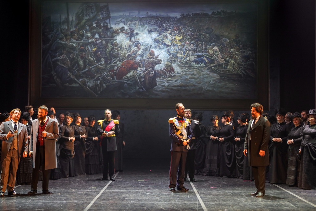 Опус начинается с выставки передвижников 1895 года, но и финальная картина вновь приглашает туда же. В этом временнóм срезе помимо Сурикова выведен ряд лиц-эпизодов (Третьяков, Репин, Нестеров, Поленов, Стасов, Лев Толстой, Гиляровский). В финале даже появляется сам Николай II, покупающий огромное полотно для национального собрания. Намеренно абстрактная условность мобильных – на наших глазах перестраиваемых – сцен компенсируется реализмом исторических костюмов. И если по ходу оперы эти сцены весь исторический репортаж, словно пазлы, складывают в единое целое, то, в зависимости от контекста действия, на видеопроекционном экране-заднике идет необходимый чейндж виртуального контента. Так что цепь режиссерских мизансцен наполняется эмоционально-образными – уточняющими и расширяющими – маркерами театрального действа.