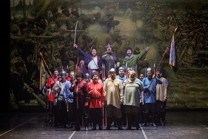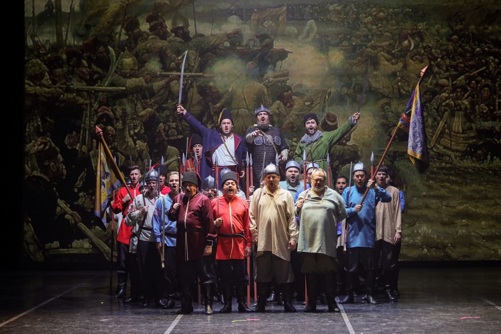 Сюжет картины – решающее сражение на Чувашем мысу между дружиной Ермака и воинами сибирского хана Кучума в 1582 году. Это полотно, ставшее в 1895 году заметной вехой выставки товарищества передвижников в Петербурге, приобрел сам Николай II для Русского музея, где с 1897 года оно экспонируется по сию пору. В зрительской программе без конкретики значится «опера в двух актах», но форма исторического репортажа, в который вовлечен широкий круг лиц, всё же больше тяготеет не к опере, а к оратории с сюжетно связанными сценами и масштабными хоровыми фресками. В первом акте – шесть, во втором – пять картин, и «репортеры» оперной оратории в плане событий XVI века – сам Ермак и частично Иван Грозный (в сцене в московском Кремле), а в плане событий XIX века – Василий Суриков. Так что уже сама форма, безусловно, интересна и необычна!