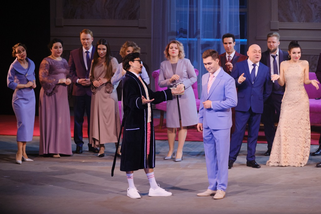 Музыкальный руководитель постановки – Александр Юдасин, но спектакль в Москве, сплошную феерию музыки из мелодически ажурных арий и ансамблево-хоровых номеров (хормейстер – Дмитрий Ходош), чарующе упоительно провел дирижер Михаил Леонтьев. При демократичности сей музыки навязывание ей новой пьесы и лишение ее французского языка – того, что само по себе уже есть музыка! – никогда не примирят меломанов-эстетов (для них сначала музыка и изящество стиля, лишь потом словá) и широкую публику (для нее сначала словá в контексте музыки, и лишь потом, если дело до этого вообще доходит, изящество стиля). Эта продукция – априори для широкой публики, и при микрофонном (практически безопорном) пении в эстетике мюзикла все ее певцы-солисты – прекрасные, прежде всего, артисты: академические аспекты вокала на тот раз остаются за кулисами.