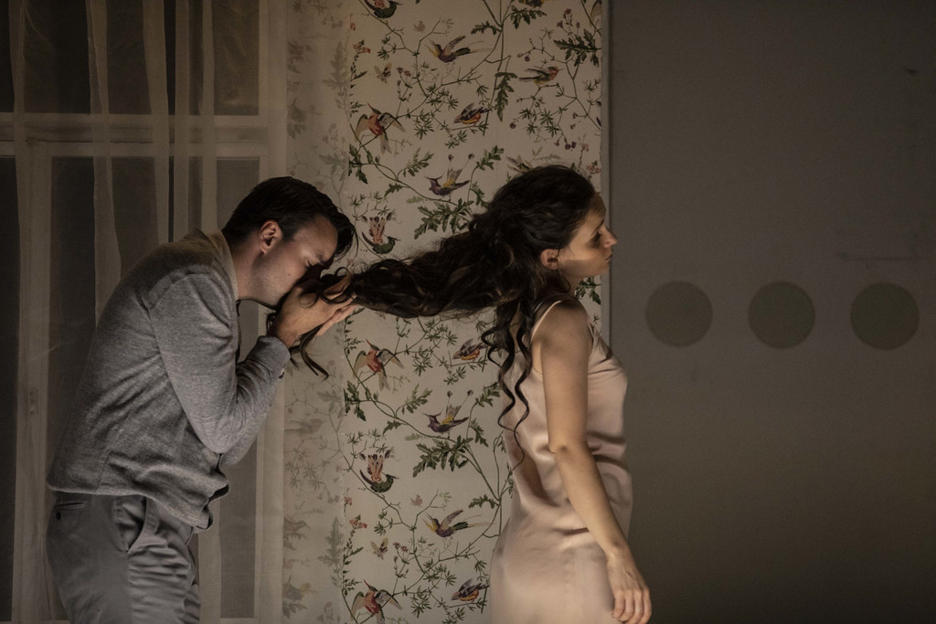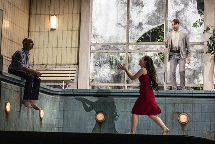 Мне показалось, что ближе к сути оперы Дебюсси приблизилась работа Митчелл, которая погрузила действие в головокружительно красивый фрагментарно-интерьерный контекст. На сцену было интересно смотреть, и всё, что там происходило, было изобретательно и стилистически гармонично. Это было увлекательно в части детальной организации пространства, которое разделялось тёмными шторками, открывавшими разные части зеркала сцены. За ними менялись, как кадры в кино, разные павильоны – то пустой заброшенный бассейн, то гостиная родителей голо и Пеллеаса, то спальня, то лестница и т.д. Этот довольно старый прием уже многими был использован в разных постановках, но приём абсолютно универсальный и сюда, конечно, тоже подошёл. И режиссер Митчелл, и сценограф Лиззи Клэчен проявили себя в этой работе скорее как прилежные ученицы, знающие основной театральный постановочный мейнстрим начала XXI в. (к тому же это всё уже было здесь же, в Экс-ан-Провансе восемь лет назад).