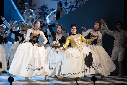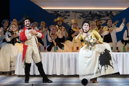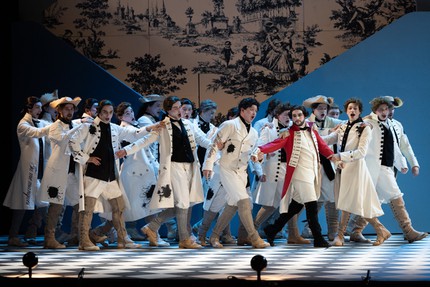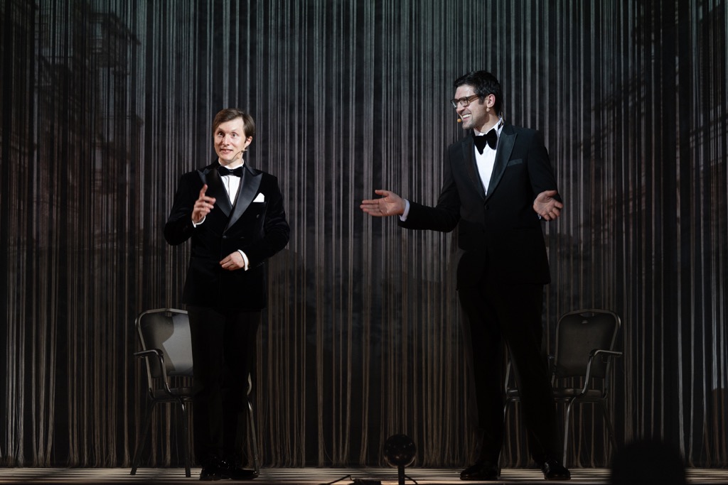 Если музыкальный руководитель и дирижер Клеман Нонсьё свои благодатные усилия объединил с хормейстером Юлией Сенюковой, собравшей хоровые страницы в читаемую на одном дыхании музыкальную книгу, то соавторами-единомышленниками режиссера стала команда. Прежде всего, это драматург Сергей Плотов, написавший русские стихи в качестве альтернативы традиционным для жанра opéra comique разговорным диалогам. Так что пара ведущих в остроумной перепалке теперь комментирует действо с авансцены и со сценического подиума за спиной дирижера. Один из конферансье предстает оперным знатоком «со стажем», другой – наивным простаком. И это тот удивительный случай, когда двуязычие «выстреливает», а драматург в опере не оказывается «свадебным генералом».
