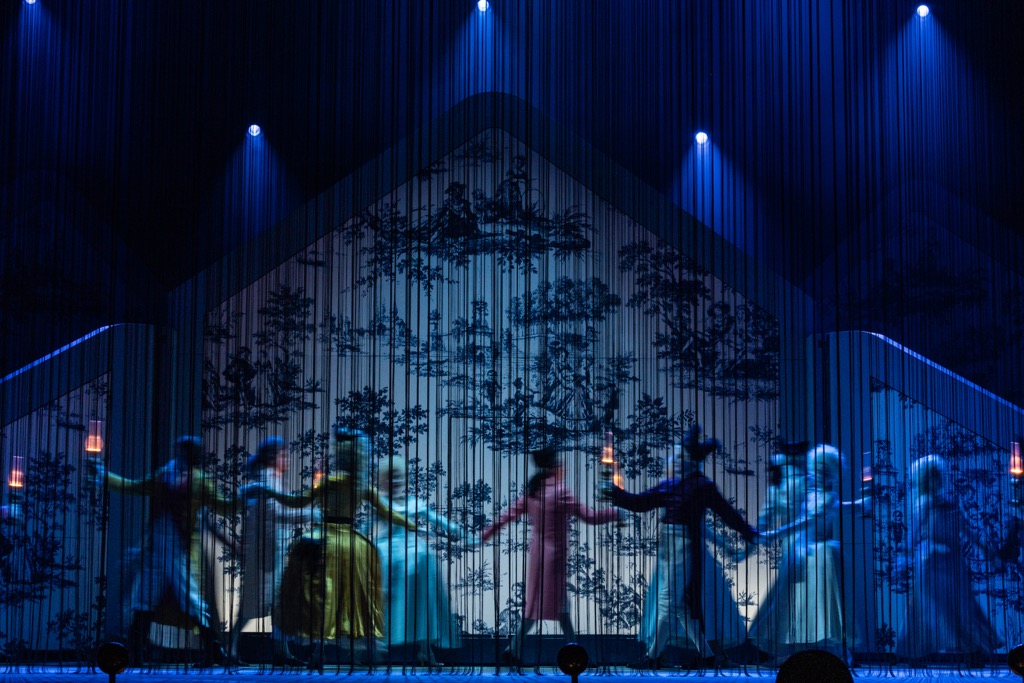 Так что в третьем акте, практически нон-стоп продолжающем второй и в обсуждаемой постановке формально идущем с «сидячим» мини-антрактом, Сен-Фару грозит виселица за двоеженство, но в итоге, сполна насладившись местью, Мадлен, прощая мужа, раскрывает карты. Привычный для подобного театрального кунштюка хеппи-энд после «опереточного неузнавания» жены мужем неожиданностью, конечно же, не становится. Данная коллизия за всю историю музыкального театра была разыграна не раз, но о ее нереалистичности, внимая музыке Адана, думать хочется меньше всего! При этом режиссер Евгений Писарев для этого смог сделать всё от него зависящее необычайно элегантно и тонко, прибегнув к костюмированной феерии и сценографической абстракции в эстетике semi-stage.