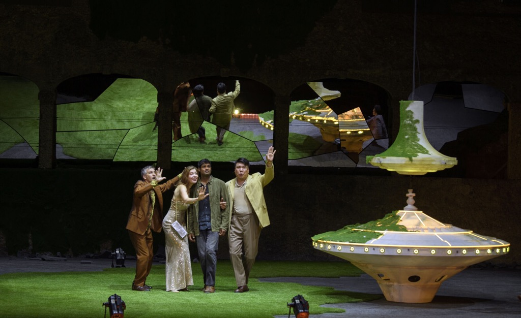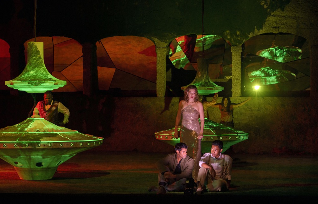 Предложенная Цыпиным светомузыка, отражающаяся в искривлённых зеркалах, вставленных в арки Скальной школы верховой езды, на сцене которой разворачивается действие, — напоминает о мерцающих болотных огнях, завлекающих людей ложными ценностями и искривлённой системой координат. И очень важно, что в этих зеркалах отражаются не только участники спектакля, но и зрители, большая часть которых, к сожалению, скучает или недоумевает от нелепых и пустых мизансцен, в которых теряются хорошие исполнители.