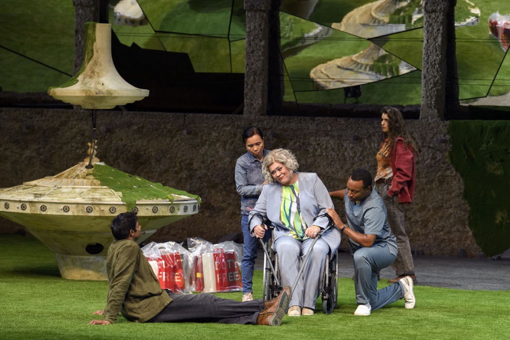 Биполярность в новом спектакле ненового уже режиссёра Питера Селларса, который уже давно отставился [1], но всё ещё выбегает на поклоны, как весёлый мотылёк, становится концептуальной проблемой. Прежде всего, это необъяснимое, если не сказать губительное привлечение на сложные русскоязычные партии нерусских певцов, а единственный русский в спектакле – изумительный бас Илья Казаков – исполняет всего три фразы в партии немецкого Барона. Это приводит к тому, что русскую оперу приходится слушать, отвлекаясь на английские или немецкие субтитры, потому что приглашённые на важные для этого произведения мужские роли американские, китайские, аргентинские и прочие прекрасные певцы не владеют русским языком. Это не просто абсурд какого-то инопланетного уровня, это непрофессиональное игнорирование важнейшей составляющей произведения С. С. Прокофьева – внятной мелодекламации.