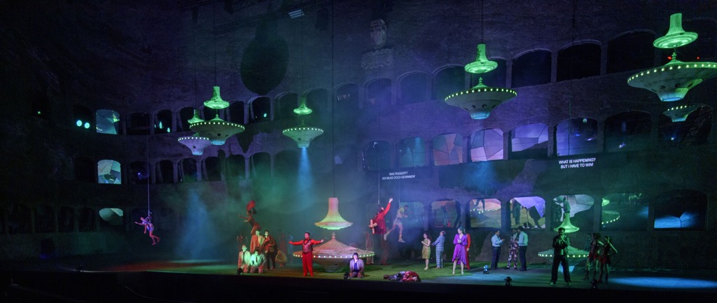 Главной удачей постановки я бы назвал сценографию Георгия Цыпина: гигантские люстры-рулетки-НЛО-тарелки, мерцающие осмысленно подобранными цветами, — единственная художественная деталь, достойная внимания в этом спектакле. Именно в сценографии прослеживается магистральная идея оперы Прокофьева как анти-вагнеровской музыкальной драмы, в которой мы видим подземелье гномов-нибелунгов, маленьких людишек, которых поработила страсть к игре.